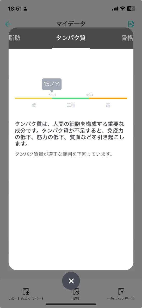 また、測定結果は正常値か、高いのか、低いのかも表示してくれます。私の場合、タンパク質が低いと表示されました。朝はプロテインを飲んでいるのですが、それでも足りないようです。