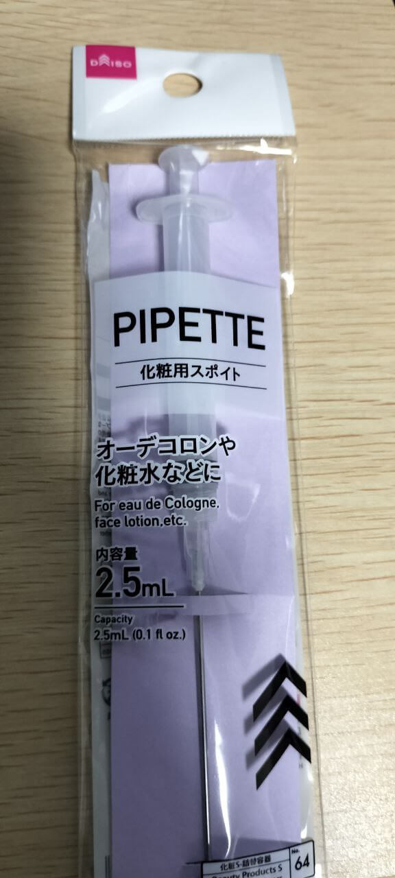 これだけだと使い勝手が悪いので、テープとドアの間に液体を差し込むように以下の化粧品用の注射器を使用しました。百均でも似たようなものが売っています。